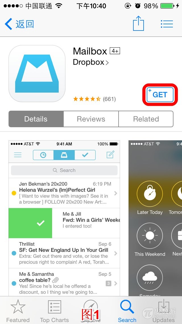 经过以上步骤后,就进入了美区 App Store 的界面。然后,随意选择一个带有「Get」字样的免费 App,以 Mailbox 为例,记住千万不要点付费的 App。