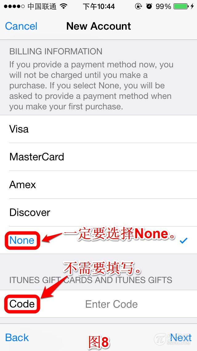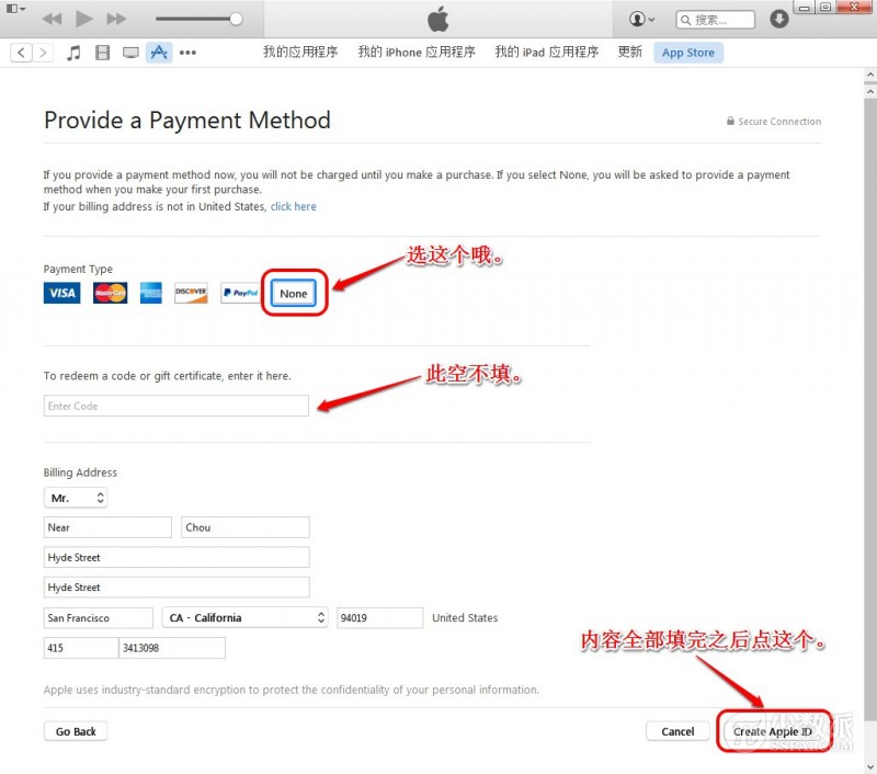 另外一种方法:请点击这个网页:http://zh-cn.fakenamegenerator.com/advanced.php,只将里面的街道邮编填进注册页面就好,请一定不要填写那个页面的信用卡信息,否则容易封号,姓名可以随意填写。之后请不断的刷新页面,直到出现了地址结尾为:AK、DE、MT、NH,NJ,OR,这五个州为免税州,以后购买 iTunes Giftcard 进行消费的时候不会多扣税。