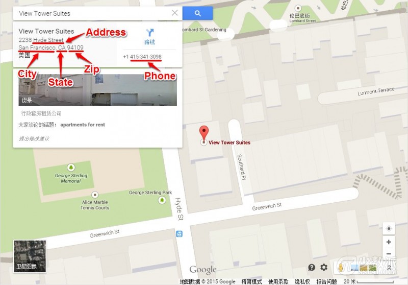 下面是最最关键的步骤,也是大家最容易出错的地方。为了填写内容的真实性,机智的笔者想到了一个好办法,就是好好利用 Google 地图。打开 Google 地图,输入 USA,选择一个洲,再选择一个城市,然后放大到能看到 Street 为止,点击某个显著的地标就能得到如下的地址信息了。