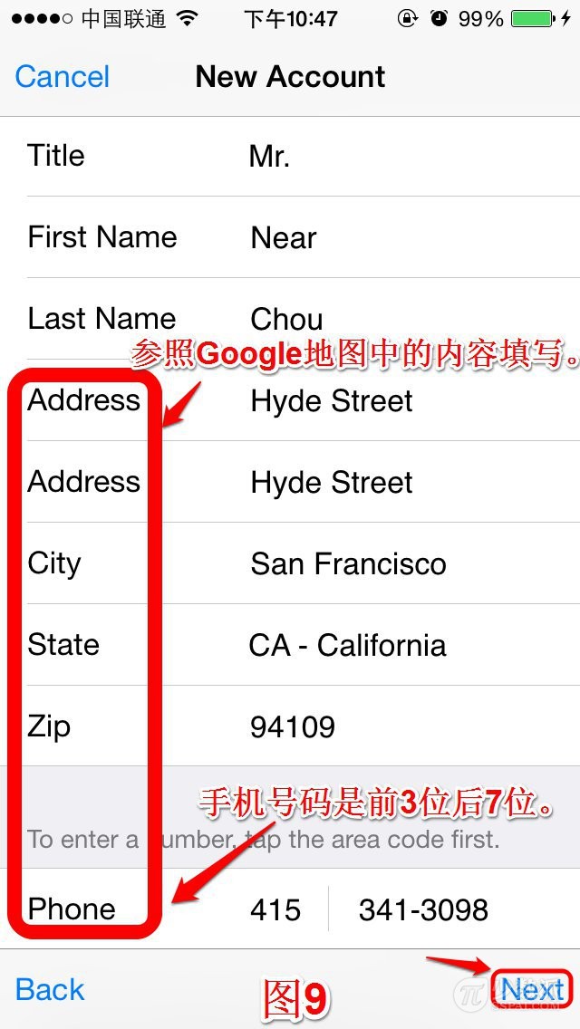 根据地图中的信息,依次填入「Address」「City」「State」「Zip」和「Phone」。学不会此法的朋友或者是拿来主义者,可以直接输入 图 9 中的内容即可。